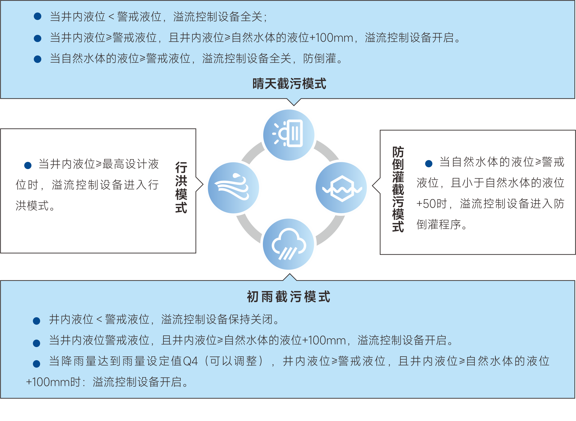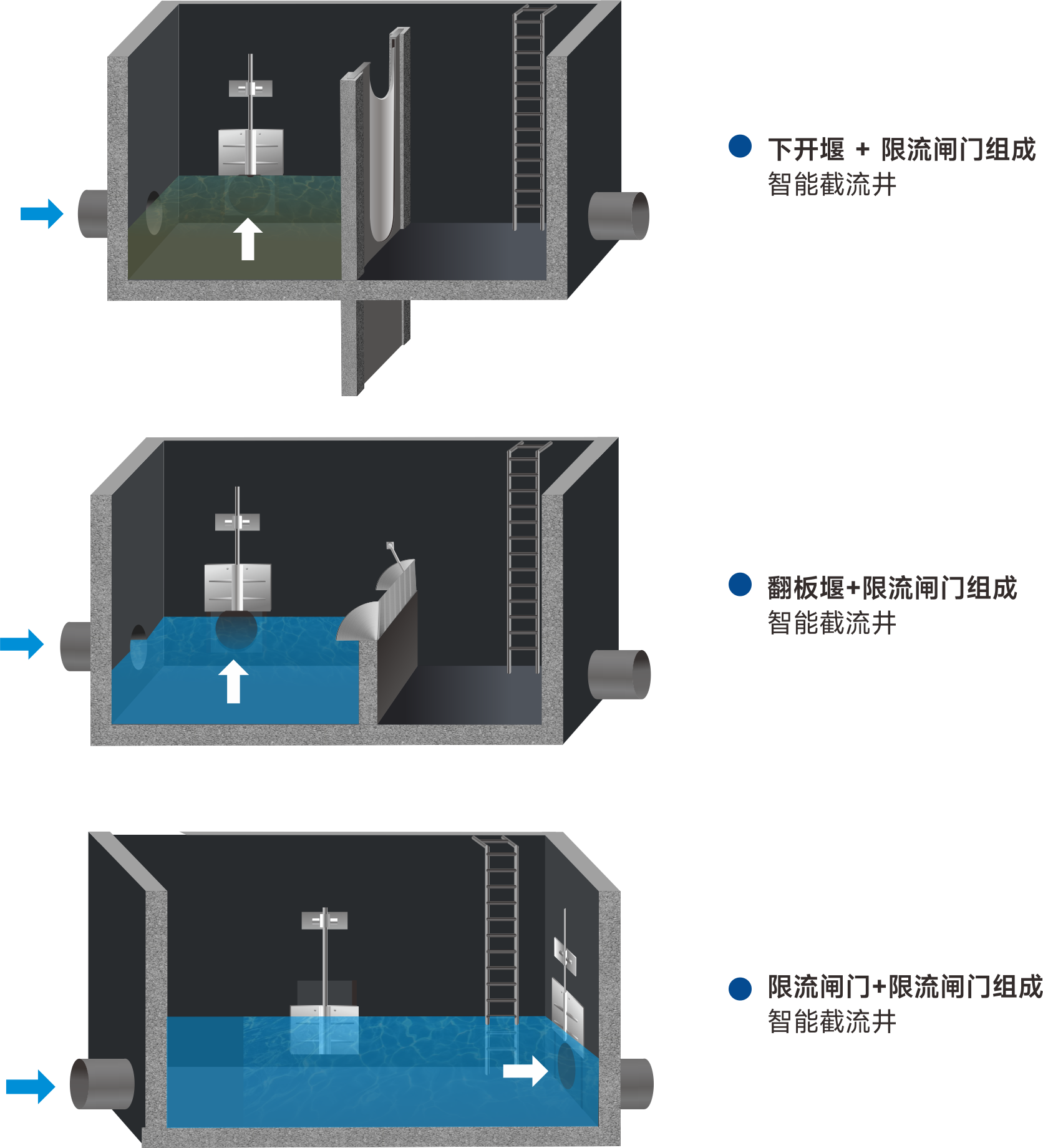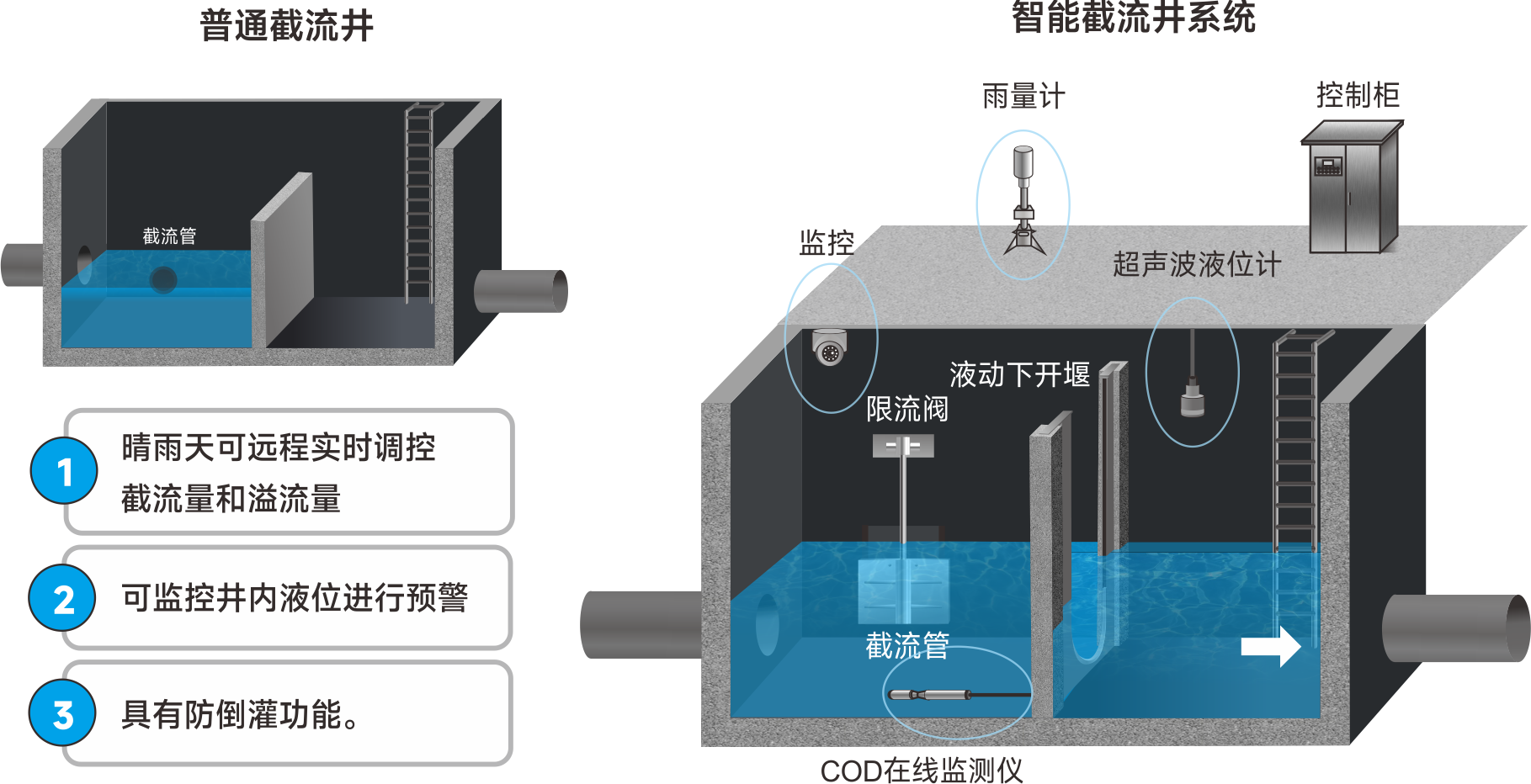 智能截流井成套设备 液动下开式堰门 液动限流阀 堰板式可调堰 智能截流井系统介绍 智能截流井用在雨污合流系统中,目的是将雨污水分离。旱季时因管中只有污水,截流井可以将污水截住,流往污水处理厂进行处理,雨季时通过控制堰门的开启度,控制溢流量,减少对河湖水体的污染。 advantage 智能截流井的优势 process 智能截流井工艺解析