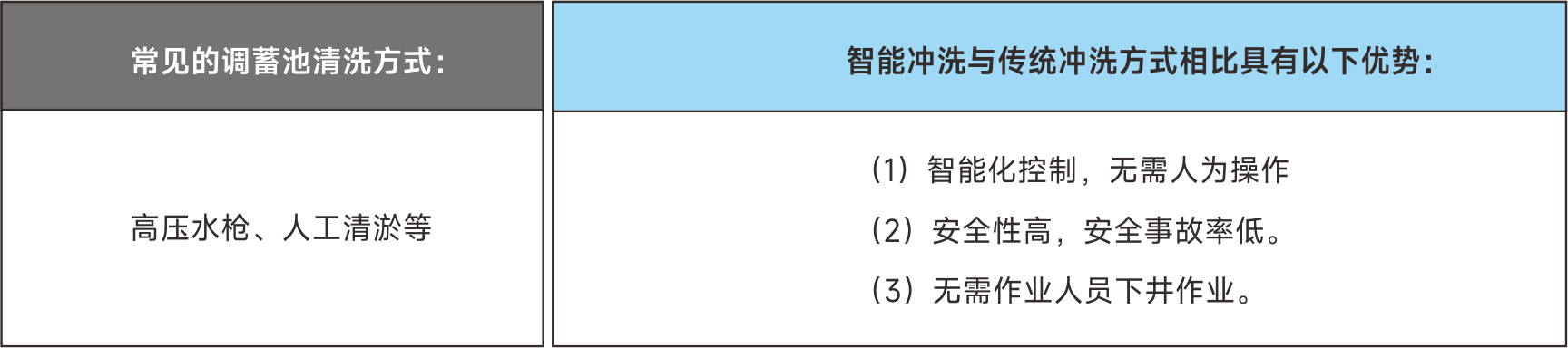 调蓄池智能冲洗系统由感知系统、冲洗设备、SCADA控制系统组成,可以实现远程操控、定点冲洗、智能化控制等功能,极大的减少了后期调蓄池运营人力成本和风险。