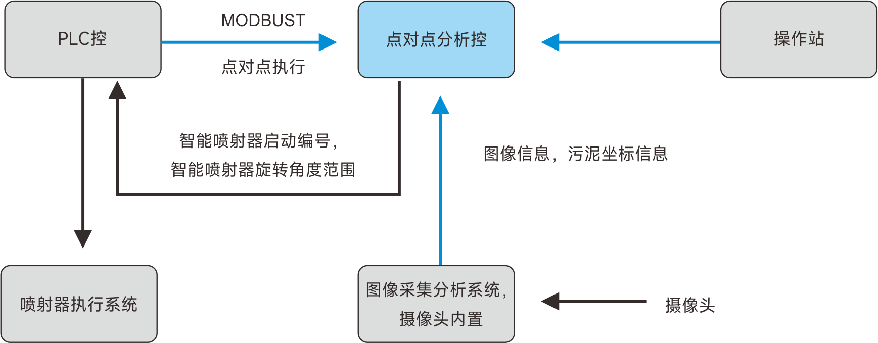 - 当在全范围冲洗结束后,PLC控制系统给点对点分析控制软件发出点对点执行命令,喷射器对应的高清摄像头自动捕捉调蓄池蓄水区底部图像,并将捕捉到的图像进行智能化网格区域,当感应到某区域有顽固淤泥时,图像采集分析系统计算出顽固淤泥坐标及图像信息,点对点分析控制软件根据坐标计算喷射器的旋转角度区间后发送给PLC控制系统,PLC控制系统根据角度和标号及停止信号执行定点冲洗。